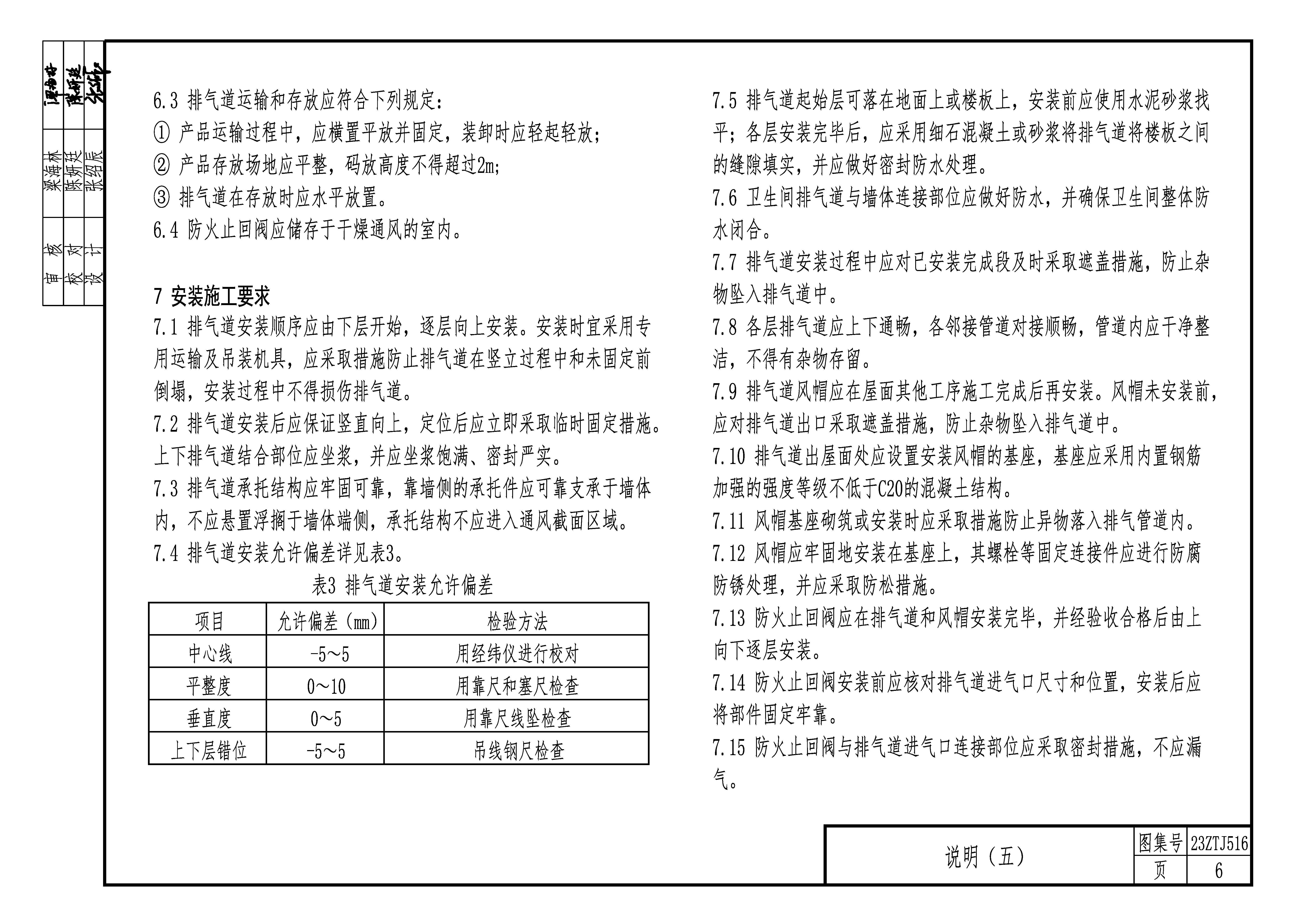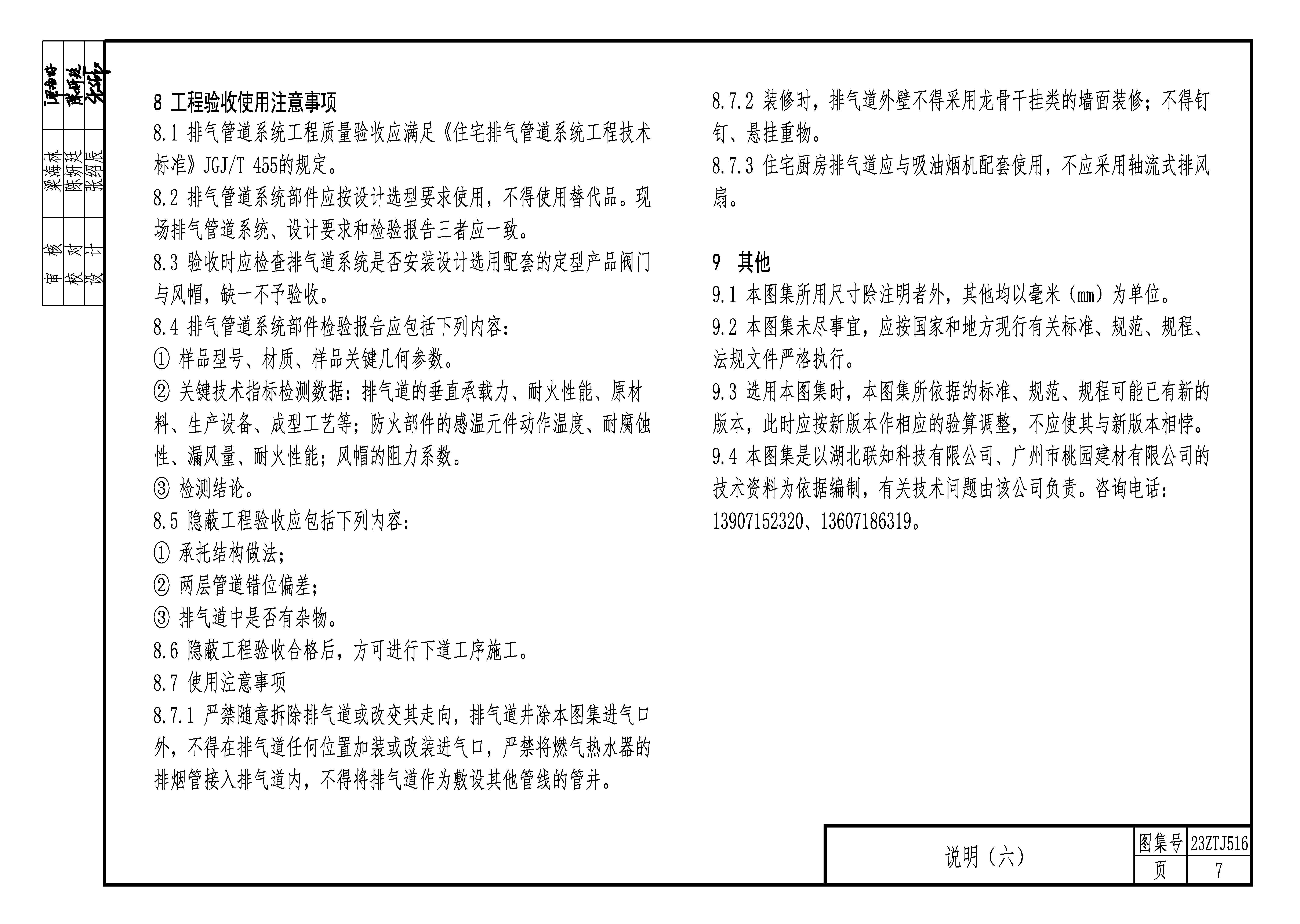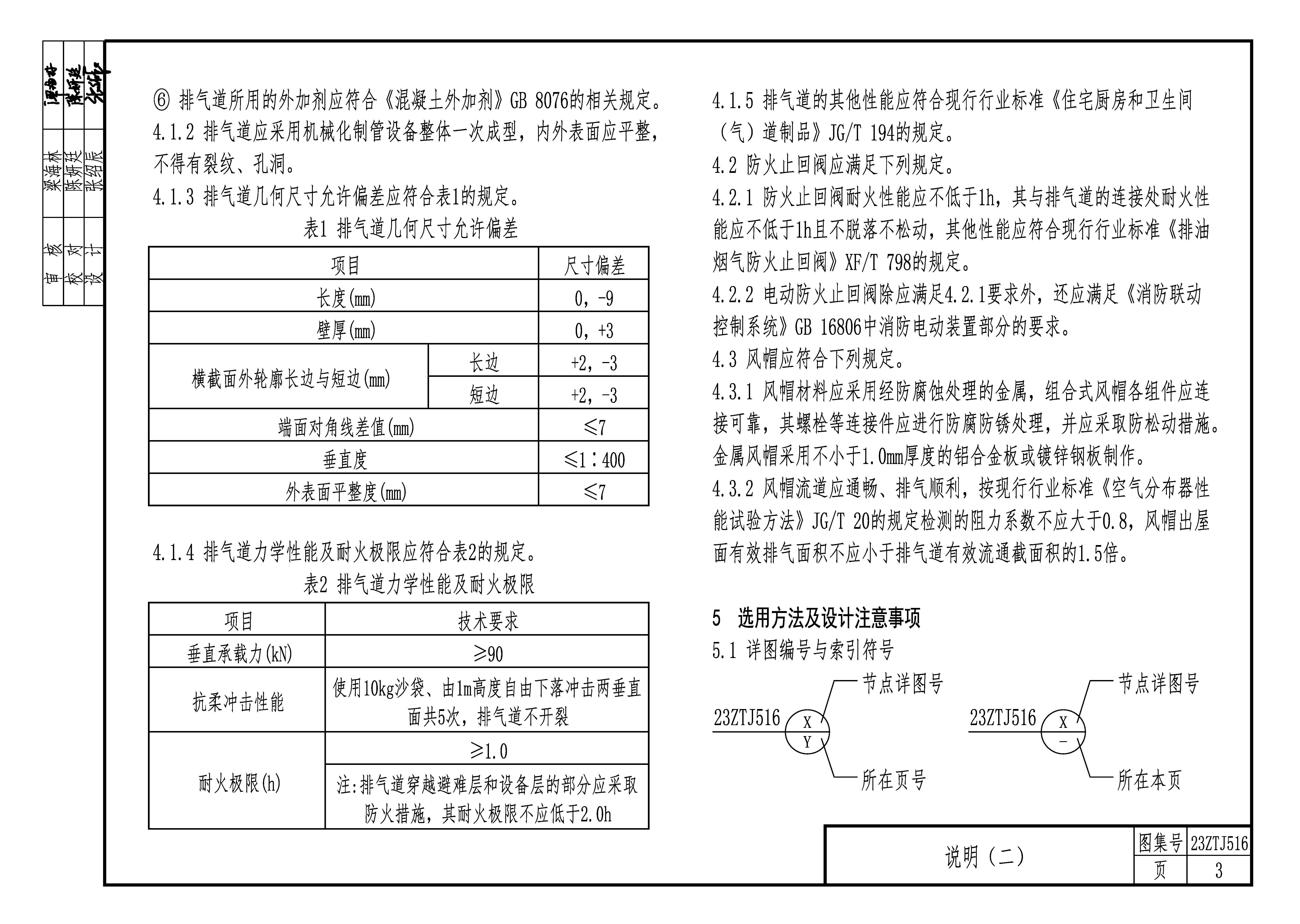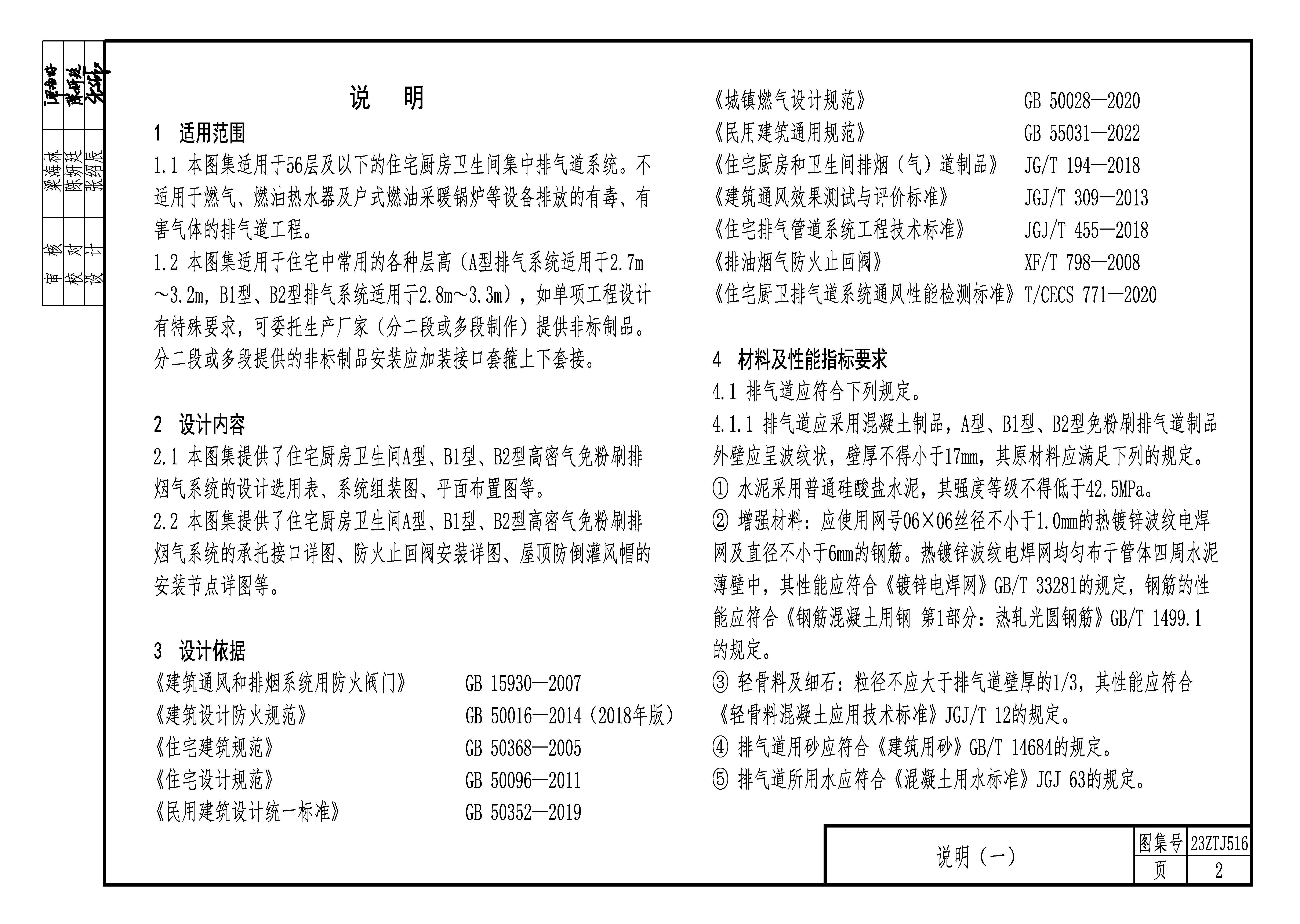 2.2本圖集提供了住宅廚房衛生間A型、B1型、B2型高密氣免粉刷排煙氣系統的承托接口詳圖、防火止回閥安裝詳圖、屋頂防倒灌風帽的安裝節點詳圖等。