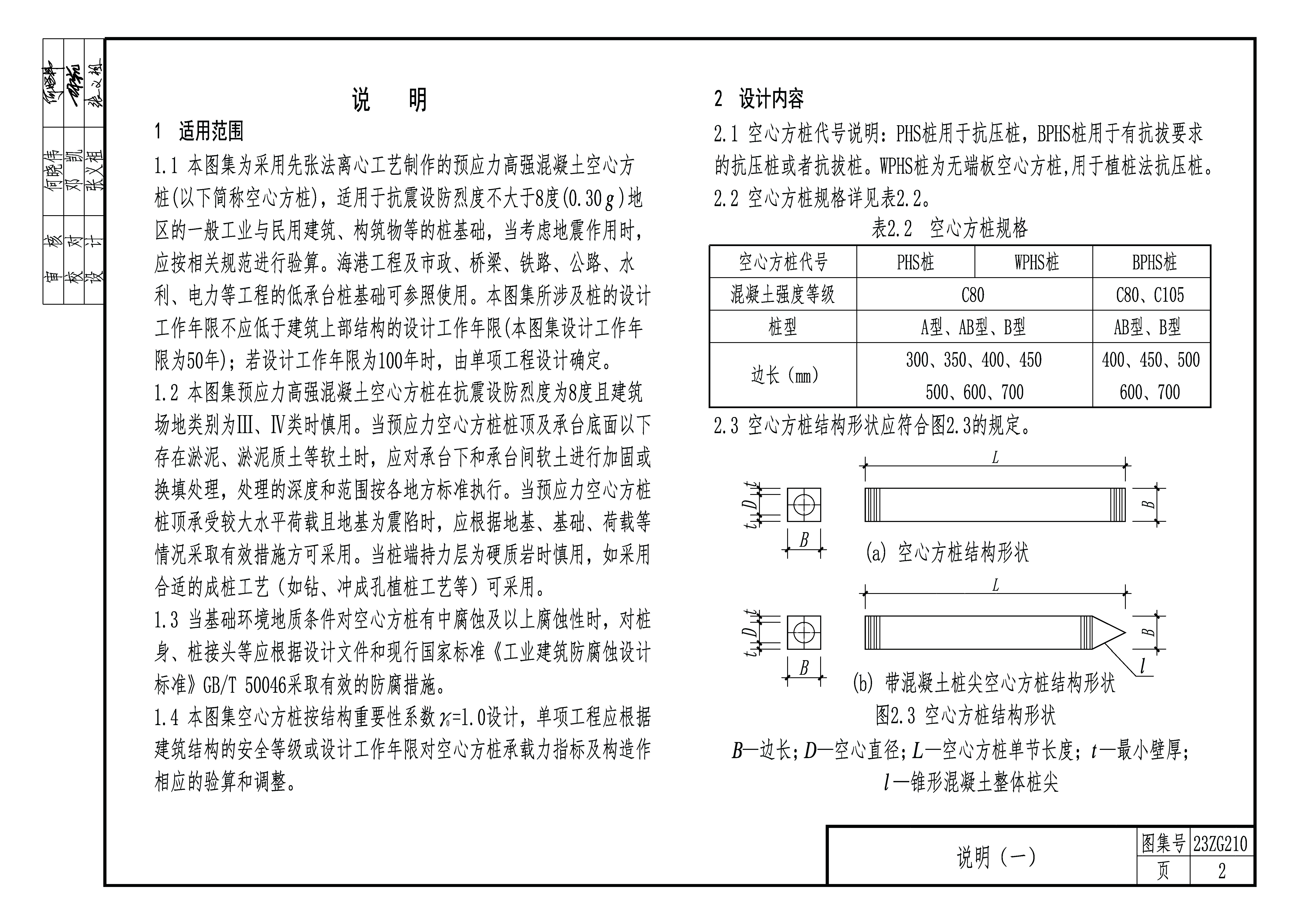 1.4本圖集空心方樁按結(jié)構(gòu)重要性系數(shù)γ0=1.0設(shè)計,單項工程應(yīng)根據(jù)建筑結(jié)構(gòu)的安全等級或設(shè)計工作年限對空心方樁承載力指標及構(gòu)造作相應(yīng)的驗算和調(diào)整。