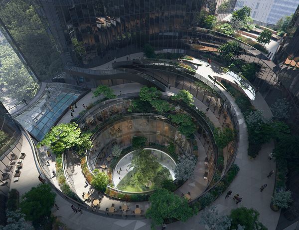 該中心融合了辦公、公寓、酒店、購物和餐飲設施以及文化和娛樂設施,每天將容納超過20,000人,是一個與城市新中央公園和江邊濕地相鄰的綜合垂直社區。從地面上的共享中央庭院向上移動到中心的天橋露臺和圍繞中央峽谷的屋頂花園,設計在一系列交織的公共空間中創造了一個多層次的城市萬花筒。