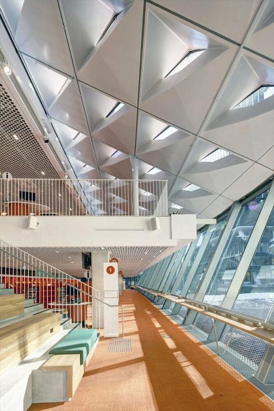 建筑的斜面設(shè)計(jì)兼具功能性和美觀性。它促進(jìn)了自然通風(fēng),讓空氣向尖頂上升,而尖頂則像煙囪一樣抽走熱氣和污濁空氣,從而減少了對空調(diào)的需求??刹僮鞯陌偃~窗進(jìn)一步加強(qiáng)了通風(fēng)效果,營造出舒適和可持續(xù)發(fā)展的室內(nèi)環(huán)境。屋頂?shù)娜切问艿教栜壽E的影響,形成了一種動態(tài)的色彩交織,就像伸手可及的云朵。從當(dāng)?shù)氐闹参镏屑橙§`感,所選用的紅色在周圍的綠色和灰色塔樓中顯得格外醒目。