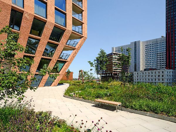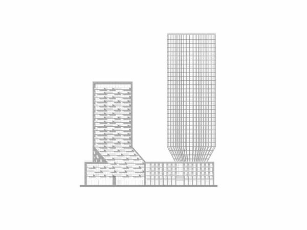 “超新星公館”大廈獨特的建筑輪廓是條形碼建筑事務所對鹿特丹KCAP地區城市規劃的創造性回應,該規劃規定了特定的容積率。為了滿足這一要求,建筑師們做出了一個大膽的決定:在底部減去體積,而在頂部增加體積,從而使塔樓看起來像雕塑一樣矗立在基座上。這種細長的結構優化了鄰近建筑的視線和自然采光,同時為住戶提供了面積達1,600平方米的屋頂花園,“超新星公館”大廈和“沉思”大廈的住戶均可享用。花園位于五層而非屋頂,與地面設施無縫連接。