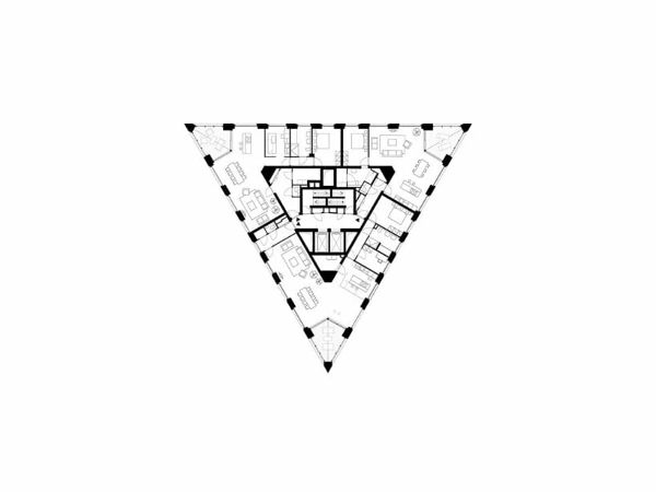 CasaNova 獨特的三角形設計為住戶提供了300度的城市全景,創造了一種高尚的生活體驗。位于三角形四角的15平方米寬敞陽臺是居住空間的室外延伸,可以沐浴清晨和傍晚的陽光。三角形的頂端朝南,可以最大限度地享受自然陽光,促進身心健康。