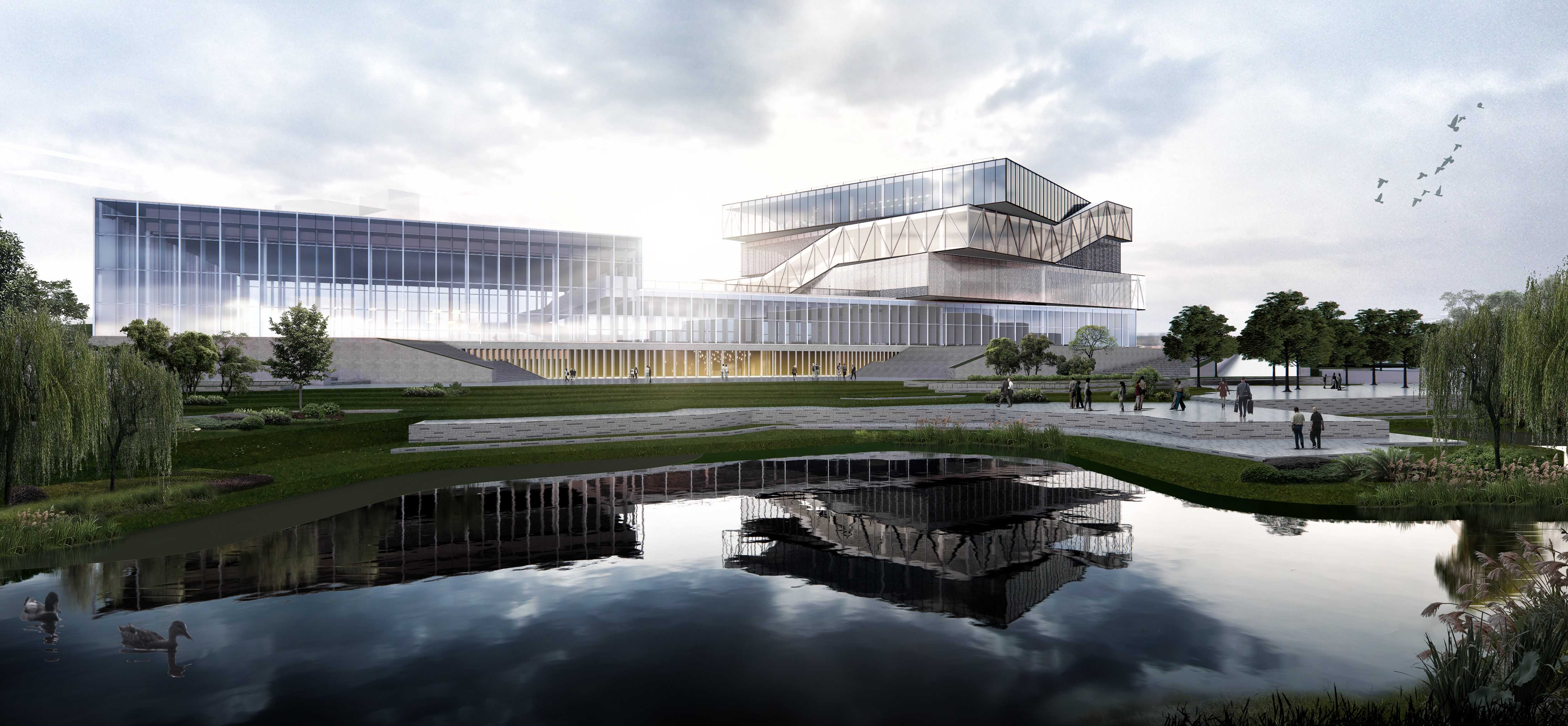 建筑兩端拔高,形成一高一矮兩處高起的體塊,達到形體平衡。高矮體塊分別形成多層塔樓及大跨度空間,滿足展覽辦公等功能需求。多層塔樓層疊旋轉(zhuǎn)后,加入外部樓梯形成連續(xù)的游覽路徑,為欣賞美景時加入運動的動感。