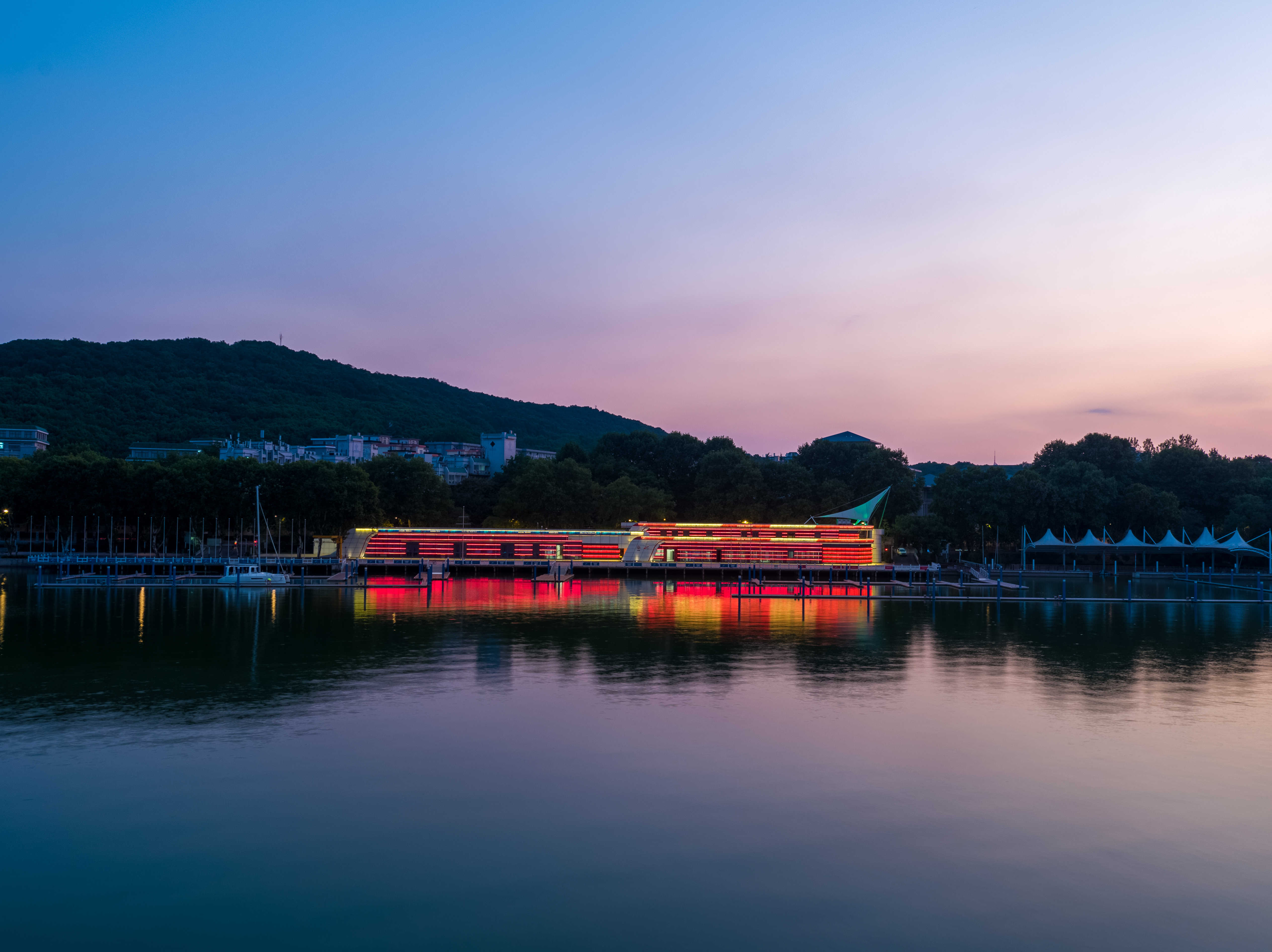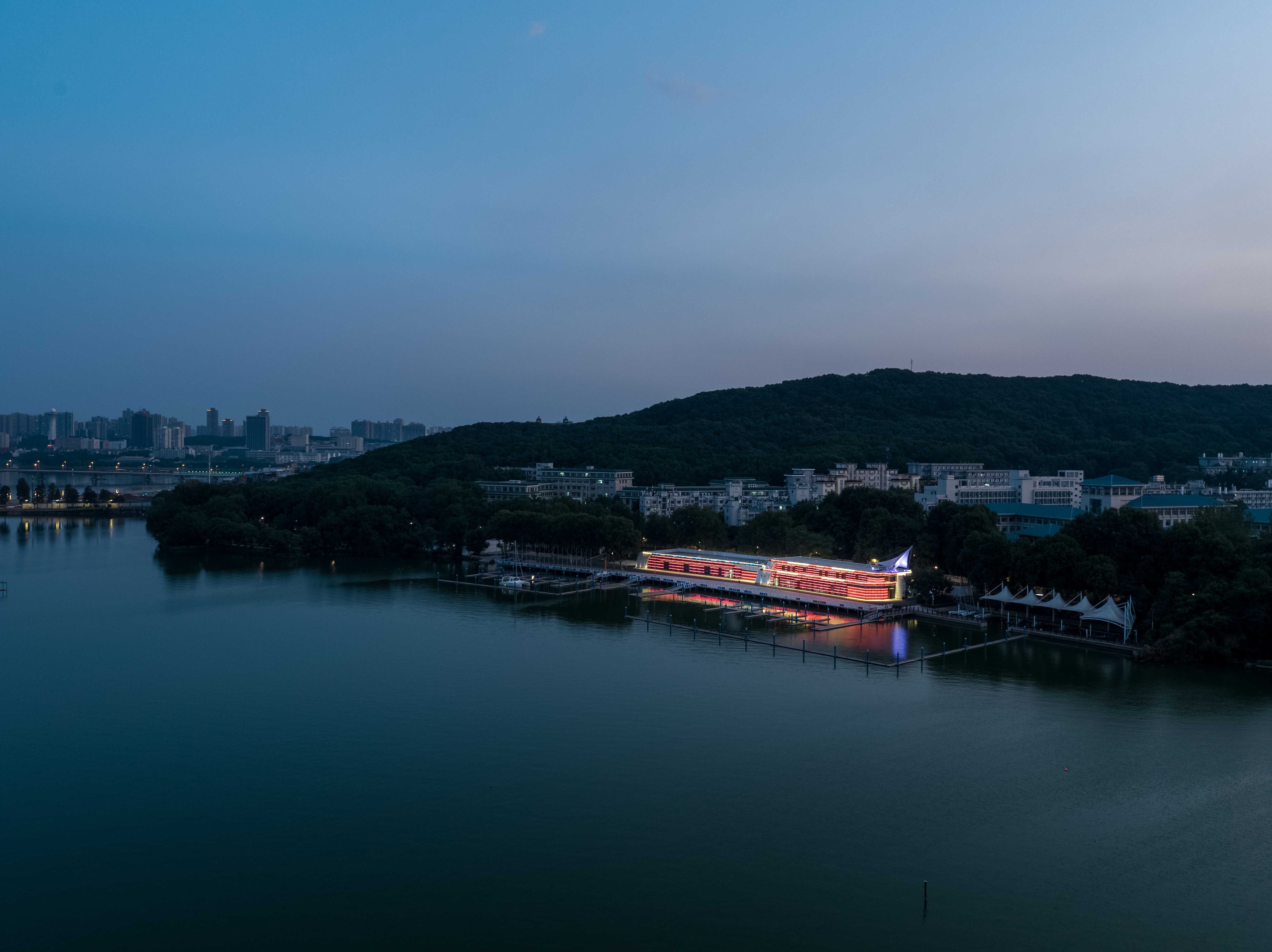 本項(xiàng)目為改造項(xiàng)目,旨在打造東湖景觀新亮點(diǎn)。帆船競賽場地建設(shè)在建筑造型上取“千帆競渡,百舸爭流”之寓意,從帆船抽象出建筑外殼的輪廓,下面的玻璃寓意水面,從遠(yuǎn)處看如同層疊競技的帆船航行于東湖之中。